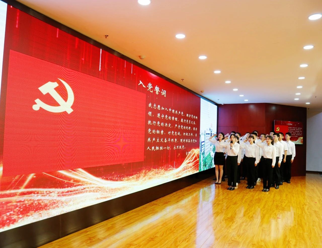 誓言錚錚,薪火相傳,面對鮮紅的黨旗,預備黨員整齊列隊,高舉右臂、緊握右拳,全場黨員一同重溫入黨誓詞,感悟中國共產黨人的初心和使命,表達對黨忠誠和為共產主義奮斗終身的決心。