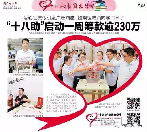 致富思源,反哺社會,積極參與助學、賑災、關愛留守兒童、關愛老人、助力城市發展等公益事業,不僅是和諧企業的需要,更是一份社會責任。近年來公司贊助武漢網球公開賽、參與《楚天都市報》“十八助”愛心助學活動、為阿拉善?SEE拯救江豚項目捐款等,還受到媒體廣泛關注。