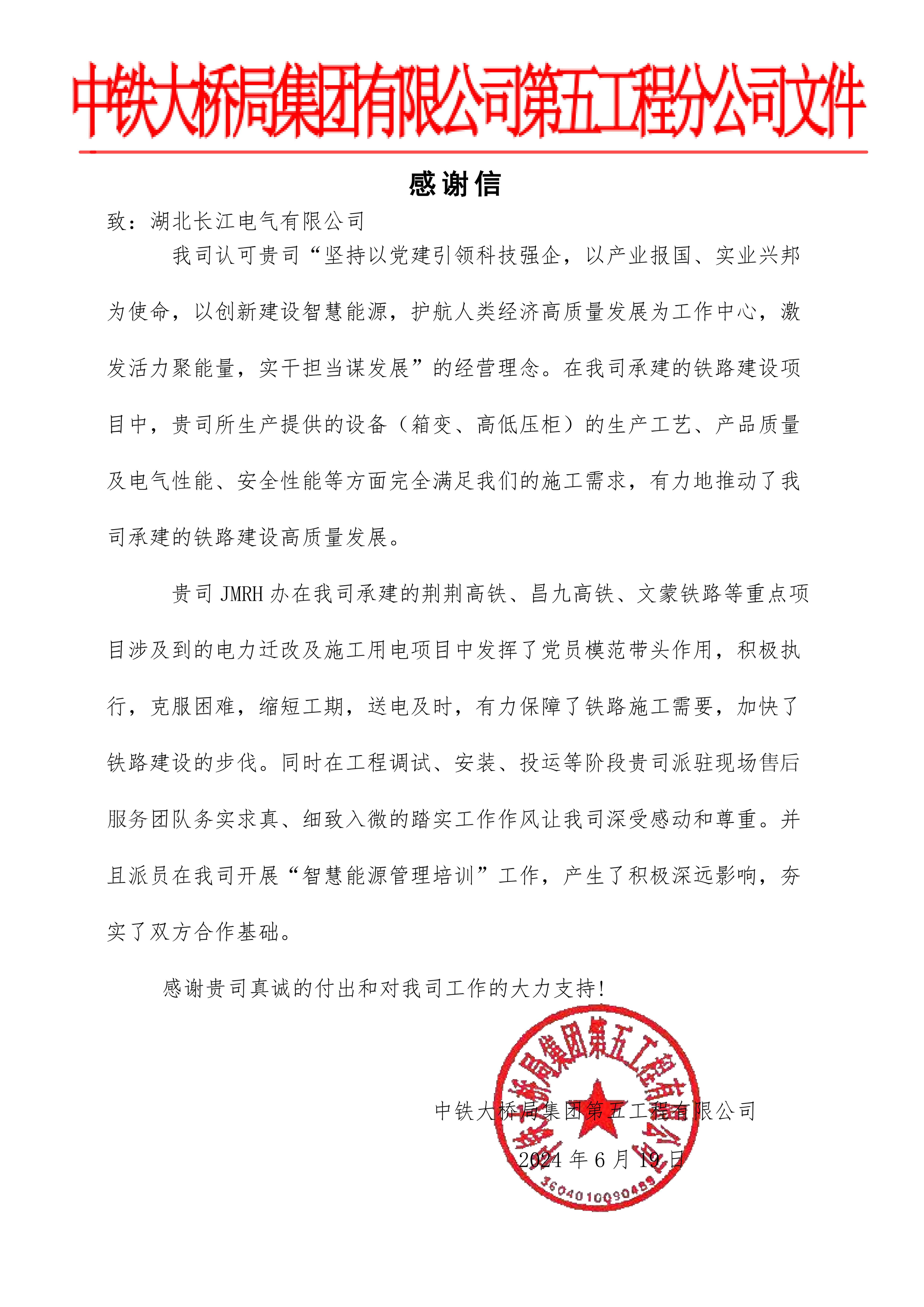 感謝信中提到:長江電氣在中鐵大橋局五公司承接的鐵路建設項目中,所生產提供設備的生產工藝、產品品質及電氣性能、安全性能等方面,完全滿足施工需求,有力推動中鐵大橋局五公司承接的鐵路建設高質量發展。