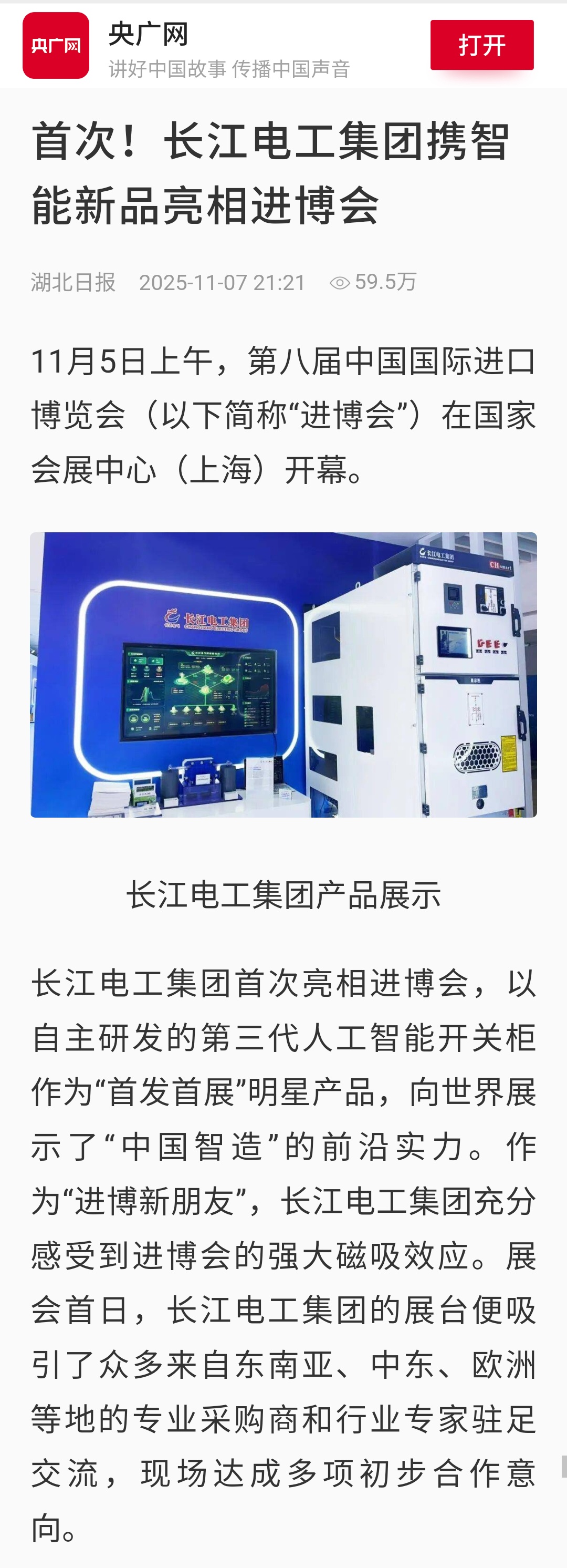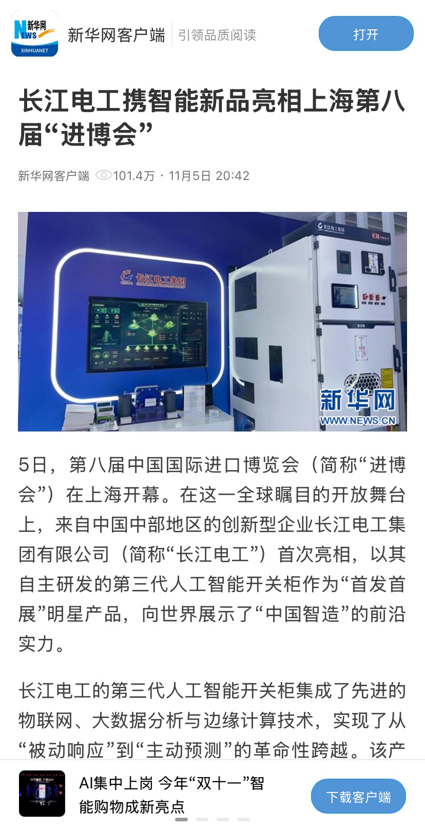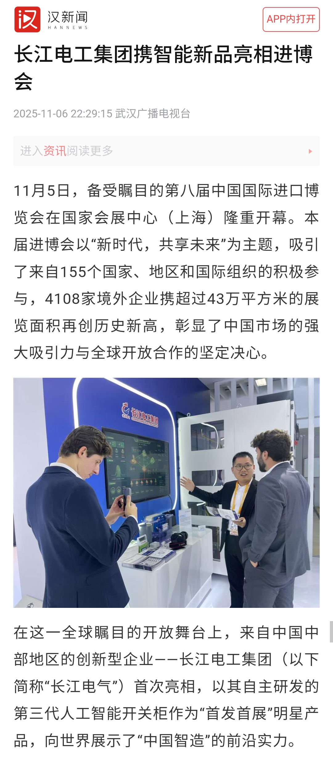 作為智能電網和新能源建設引領者,長江電工集團以“首發首展”的第三代人工智能開關柜為核心展品,攜多款自主研發成果首次亮相進博會,吸引包含中央廣播電視總臺新聞頻道、中央廣播電視總臺中文國際頻道、新華網、央廣網、中國新聞網、湖北日報、湖北電視臺等中央及省級媒體廣泛關注和聚焦報道。