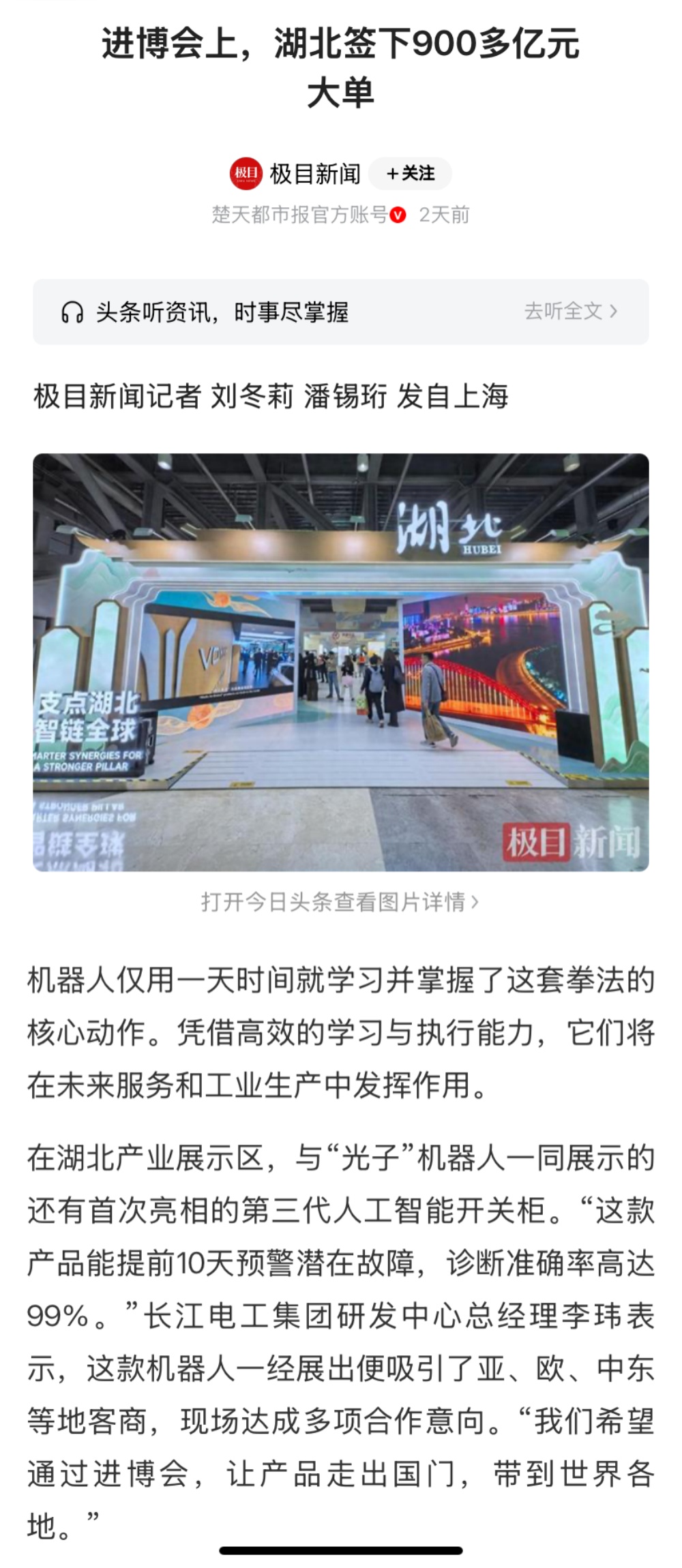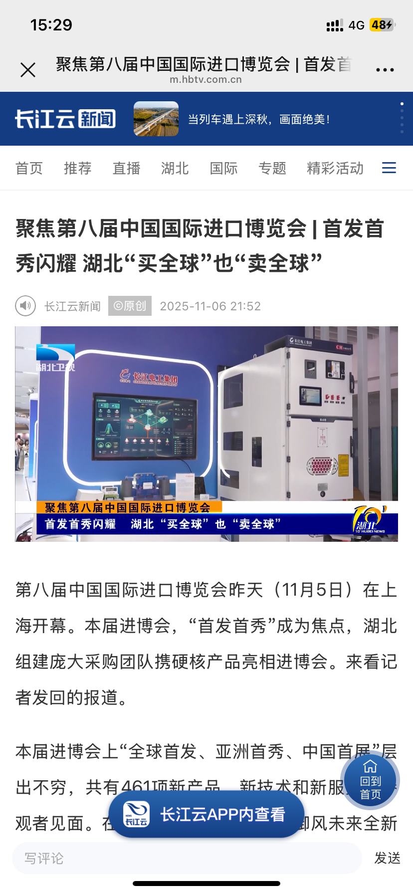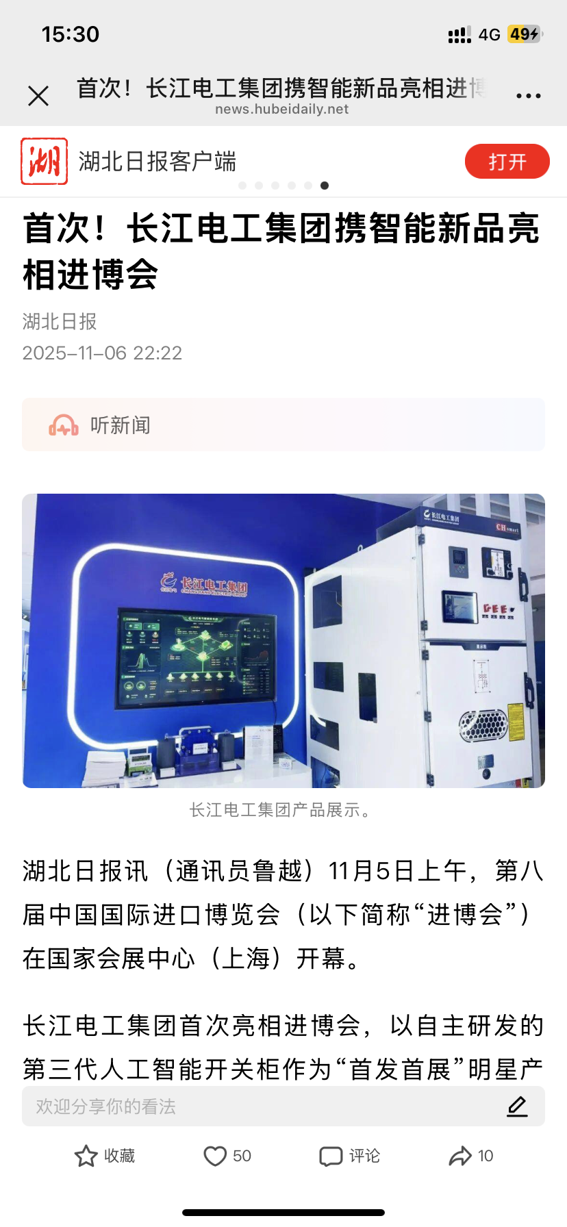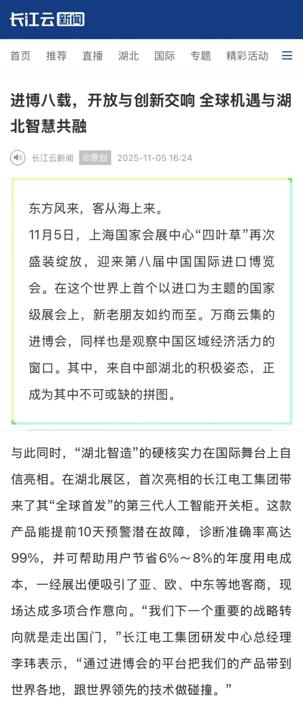 作為智能電網和新能源建設引領者,長江電工集團以“首發首展”的第三代人工智能開關柜為核心展品,攜多款自主研發成果首次亮相進博會,吸引包含中央廣播電視總臺新聞頻道、中央廣播電視總臺中文國際頻道、新華網、央廣網、中國新聞網、湖北日報、湖北電視臺等中央及省級媒體廣泛關注和聚焦報道。