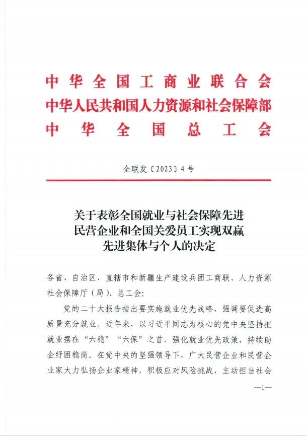 ▲《關(guān)于表彰全國就業(yè)與社會保障先進民營企業(yè)和全國關(guān)愛員工實現(xiàn)雙贏先進集體與個人的決定》及附件(部分)