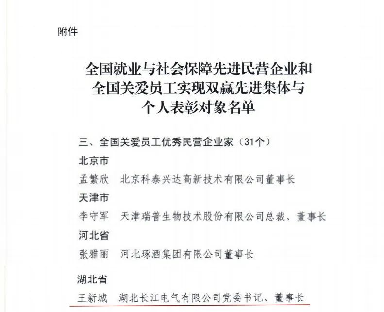 近日,中華全國工商業(yè)聯(lián)合會、中華人民共和國人力資源和社會保障部、中華全國總工會發(fā)布《關(guān)于表彰全國就業(yè)與社會保障先進民營企業(yè)和全國關(guān)愛員工實現(xiàn)雙贏先進集體與個人的決定》,長江電氣黨委書記、董事長王新城榮獲湖北省唯一“全國關(guān)愛員工優(yōu)秀民營企業(yè)家”稱號,長江電氣員工張作頓榮獲湖北省唯一“全國熱愛企業(yè)優(yōu)秀員工”稱號。