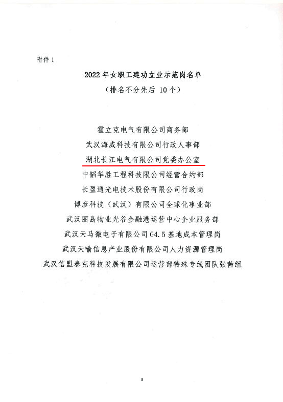 3月3日,武漢東湖高新區光電園總工會發布表彰通知,長江電氣黨辦榮獲2022 年度“女職工建功立業示范崗”榮譽稱號。